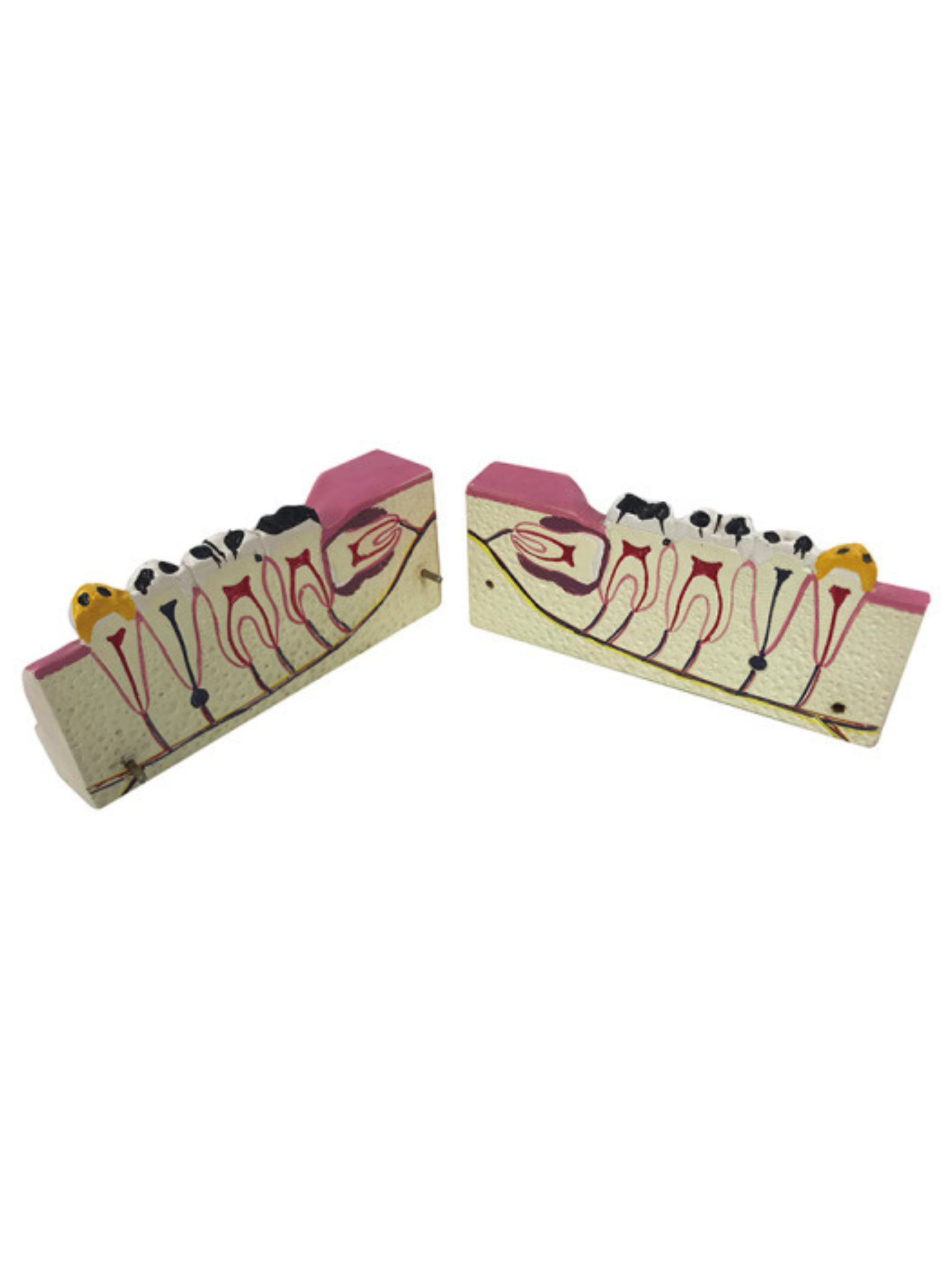 This partial model of the lower jaw shows the human molars with various ailments. Cavities are displayed in various stages–from a superficial cavity to a complete destruction of the crown. The 2-part model can be separated longitudinally for a detailed view of the interior.
