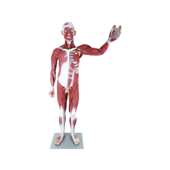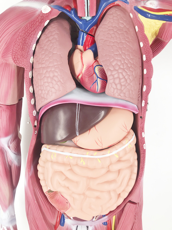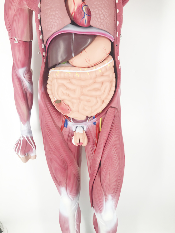 The model is an anatomically accurate representation of the human anatomy, complete with superficial and deep musculature, the digestive system, lymphatic system, respiratory system, urinary system, circulatory system, endocrine system, and nervous system. Our model has removable organs and dissectible features for a complete educational experience.