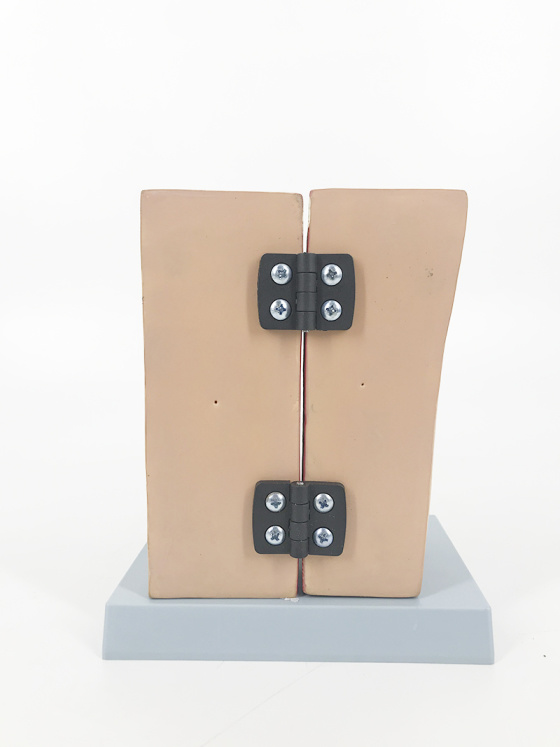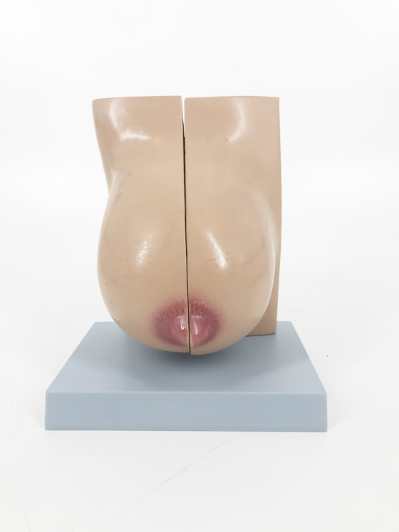 This model opens in half to display all internal structures of a female breast during lactation. It is able to stay closed by a metal hook, and is mounted on a secure white base for easy display and storage.