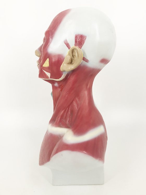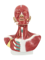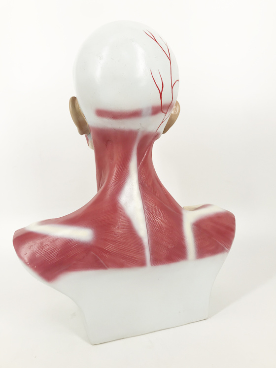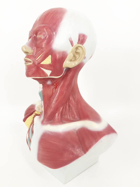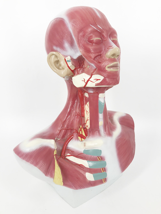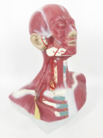 This model shows the muscle of the head, neck and superior thoracic region. Superficial and deep musculature are well represented, as are the pathways of the subclavian and carotid arteries.